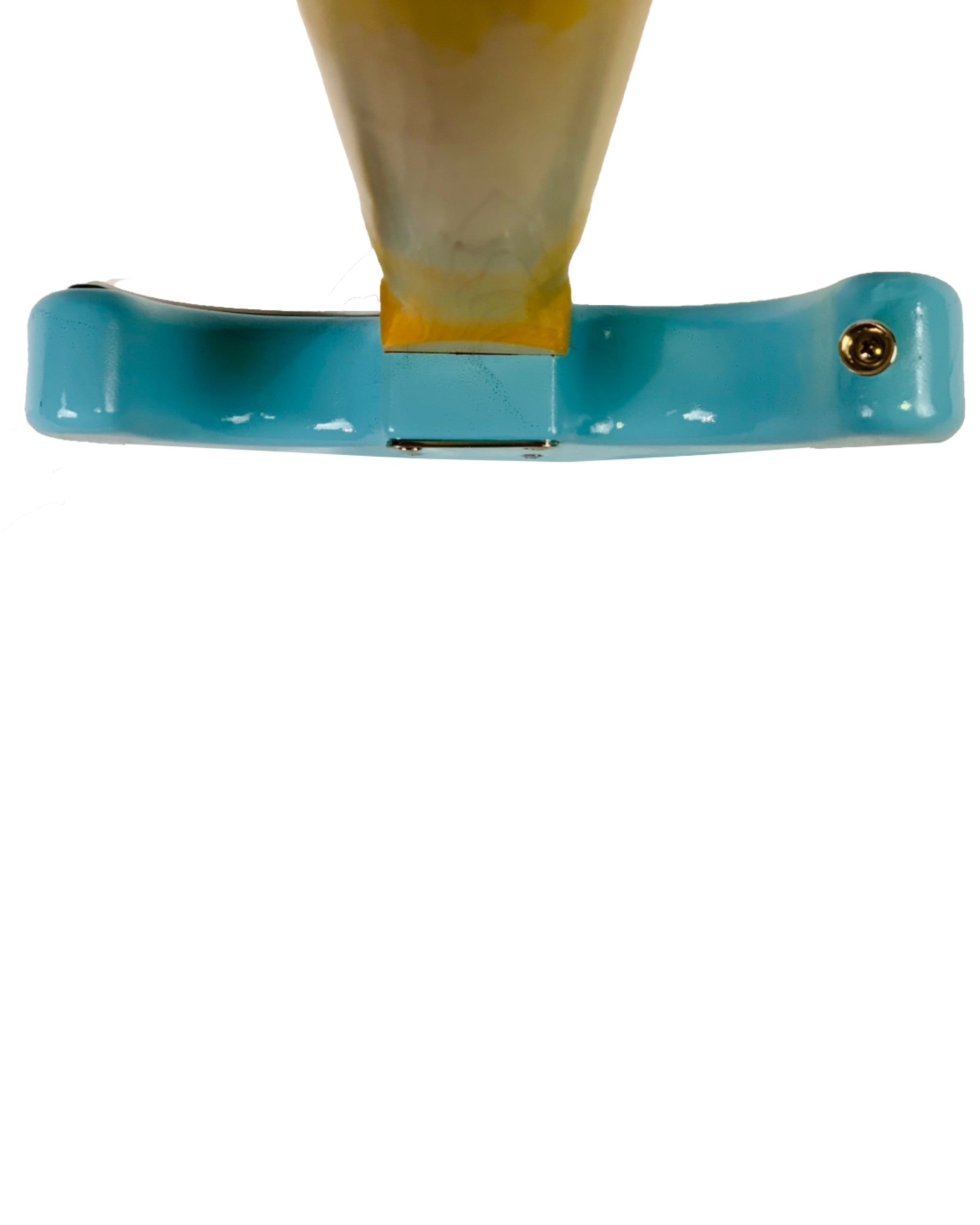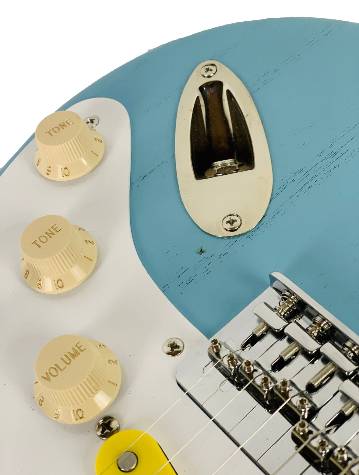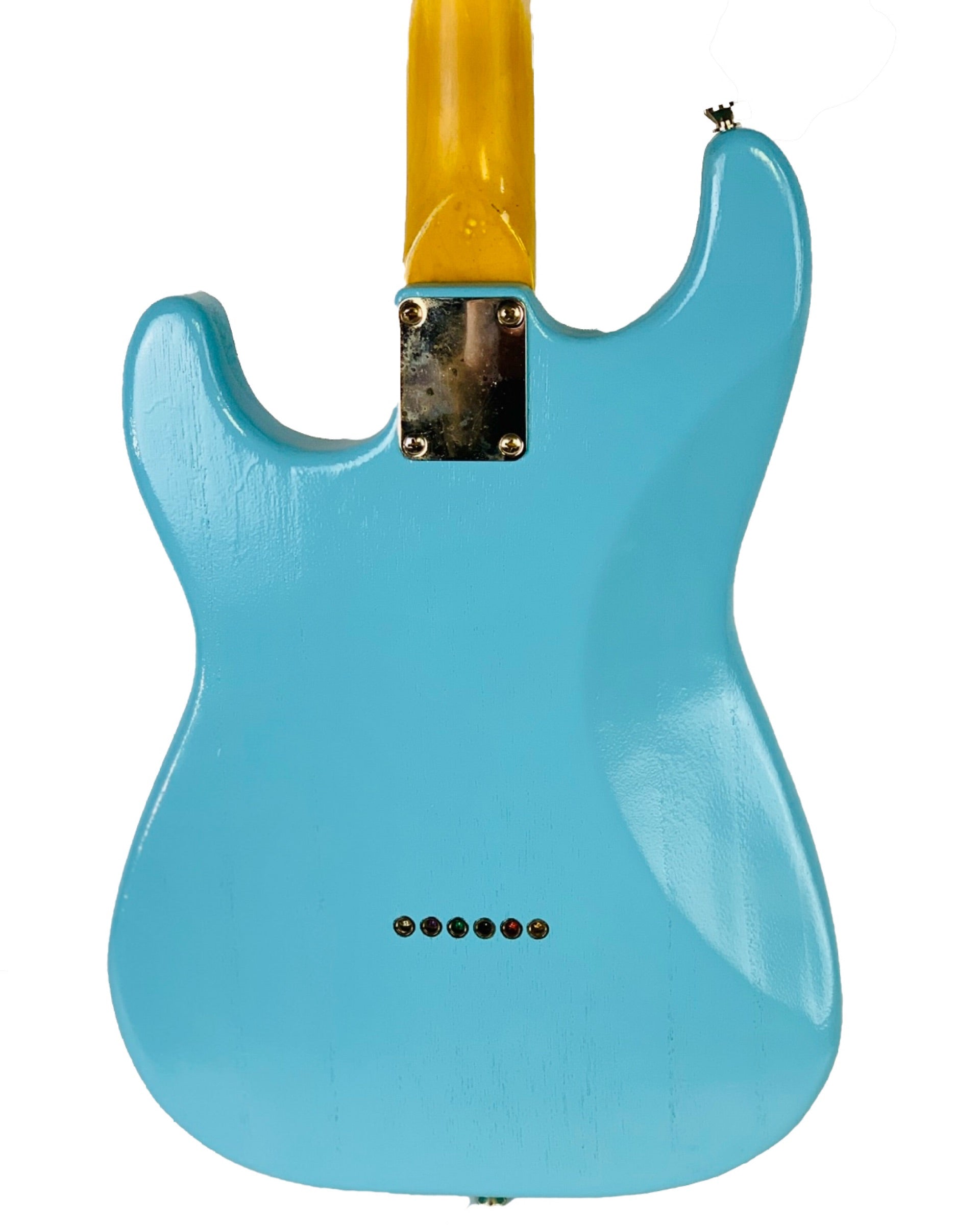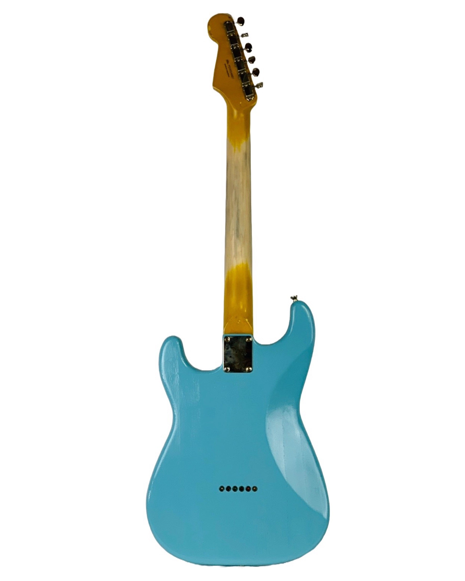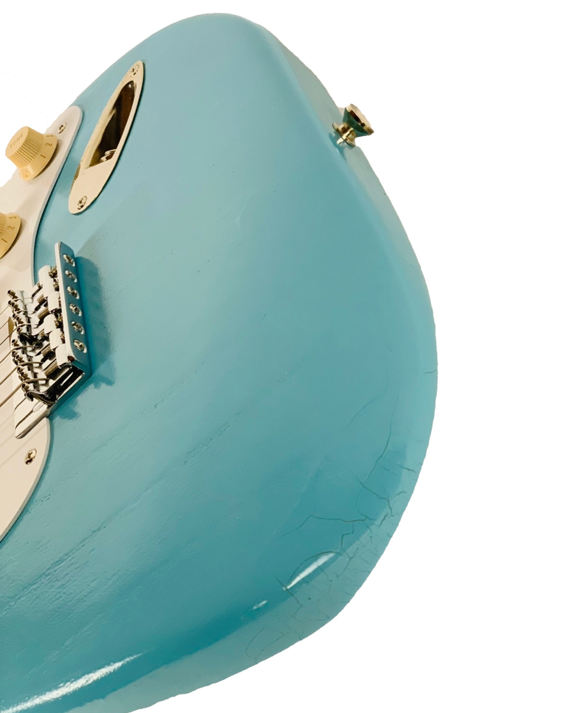 Baby blue, thin, nitro-cellulose lacquer, with finish checking.